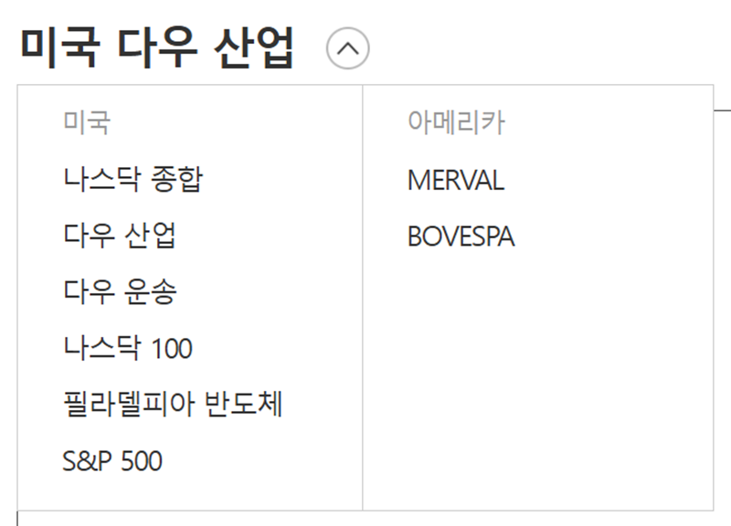 5. 지수 이름 옆의 화살표를 누르면 미국 증시의 다른 주요 지수들로 바로 이동할 수 있습니다. '나스닥 종합', 'S&P 500', '필라델피아 반도체' 등 투자자들이 자주 확인하는 다양한 지수 목록이 나타나 원하는 정보로 빠르게 화면을 바꿀 수 있습니다.