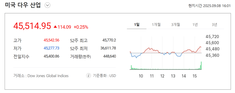 3. '미국 다우 산업' 지수를 살펴보면 현재 지수와 전일 대비 등락률을 즉시 확인할 수 있습니다. 고가, 저가, 52주 최고 및 최저치와 같은 상세한 수치와 함께 시간대별 움직임을 나타내는 그래프가 있어 하루 동안의 변동 흐름을 시각적으로 쉽게 이해할 수 있습니다.