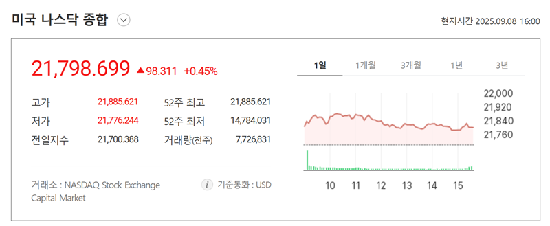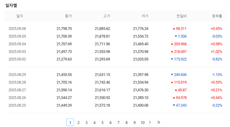 7. 나스닥 종합 지수의 일자별 데이터도 확인 가능합니다. 매일의 종가, 고가, 저가, 전일 대비 변동 수치 및 등락률을 표를 통해 날짜별로 명확하게 비교해볼 수 있어, 시장의 흐름을 연속적으로 추적하고 분석하는 데 도움이 됩니다.