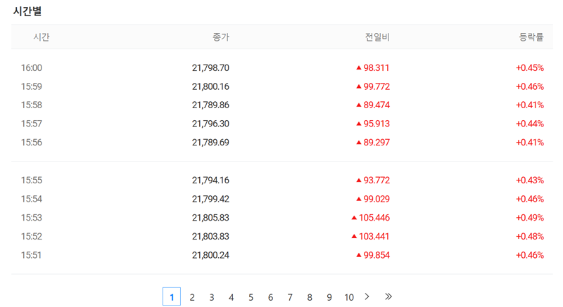 8. 더 상세하게는 시간별 시세 정보까지 살펴볼 수 있습니다. 장 마감 시각을 기준으로 분 단위까지의 지수 변화를 기록하여 보여주기 때문에, 장 막판의 미세한 움직임이나 특정 시간대의 변동성을 자세히 들여다보고 싶을 때 참고하기 좋은 자료입니다.