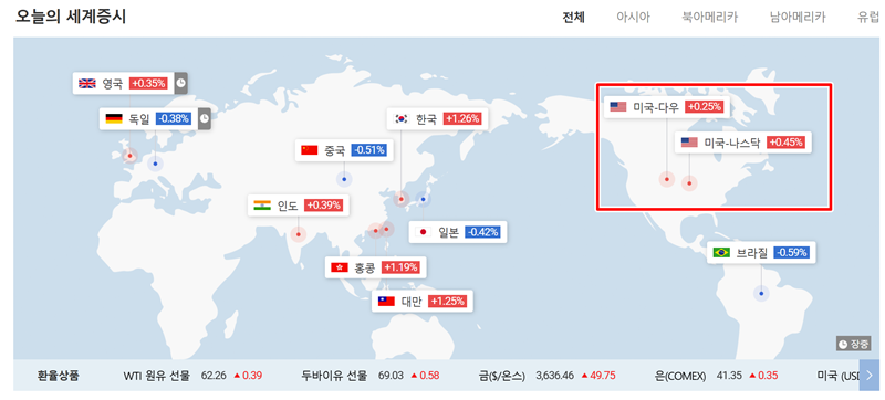 2. 전 세계 증시 현황을 지도로 보여주는 화면이 나타납니다. 아시아, 북아메리카, 남아메리카, 유럽 등 대륙별로 주요 국가의 지수 등락을 확인할 수 있습니다. 여기서 미국 국기가 표시된 '미국 다우'나 '미국 나스닥' 부분을 통해 해당 증시의 개요를 파악할 수 있습니다.