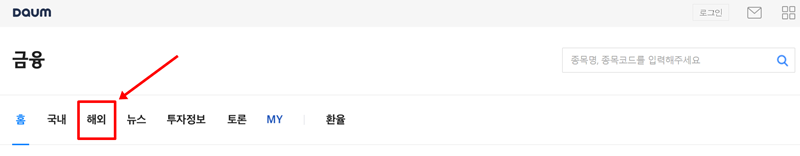 1. 다음 금융 홈페이지에 접속한 다음, 금융 홈 화면 상단에 있는 여러 갈래의 목록 중에서 '해외' 항목을 찾아 선택하면 세계 증시 정보를 살펴볼 수 있는 화면으로 넘어갑니다. 국내 증시뿐만 아니라 다양한 국가의 경제 상황을 확인할 수 있는 첫 단계입니다.