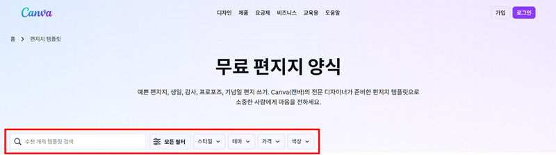 1. 홈페이지에 들어가면 수많은 편지지 템플릿을 바로 만날 수 있어요. 상단 검색창에 '가을'이나 '생일'처럼 원하는 분위기나 주제를 입력해서 찾아보거나, '스타일', '테마', '색상' 같은 필터를 설정해서 원하는 결과만 추려볼 수도 있습니다. 마음에 드는 디자인을 찾는 과정이 훨씬 수월해져요.