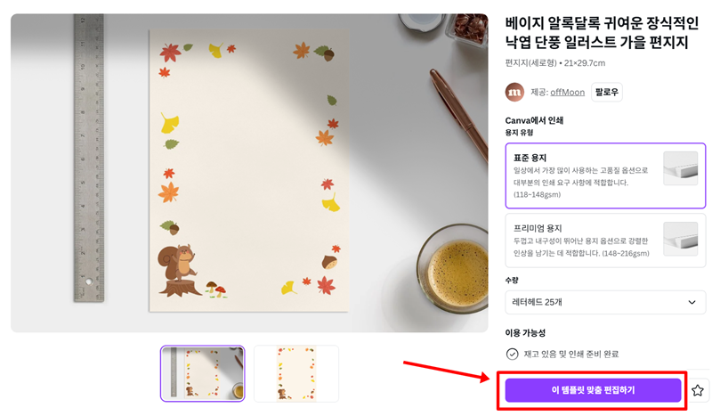 3. 고른 디자인을 상세히 확인할 수 있는 화면이 나타나요. 편지지가 실제로 어떻게 보이는지, 어떤 느낌인지 미리 살펴볼 수 있죠. 이 편지지를 다운로드하려면 '이 템플릿 맞춤 편집하기'를 눌러 이용할 수 있습니다. 이제부터 나만의 편지를 만들 수 있는 편집 화면으로 이동해서 내용을 채워 넣게 됩니다.