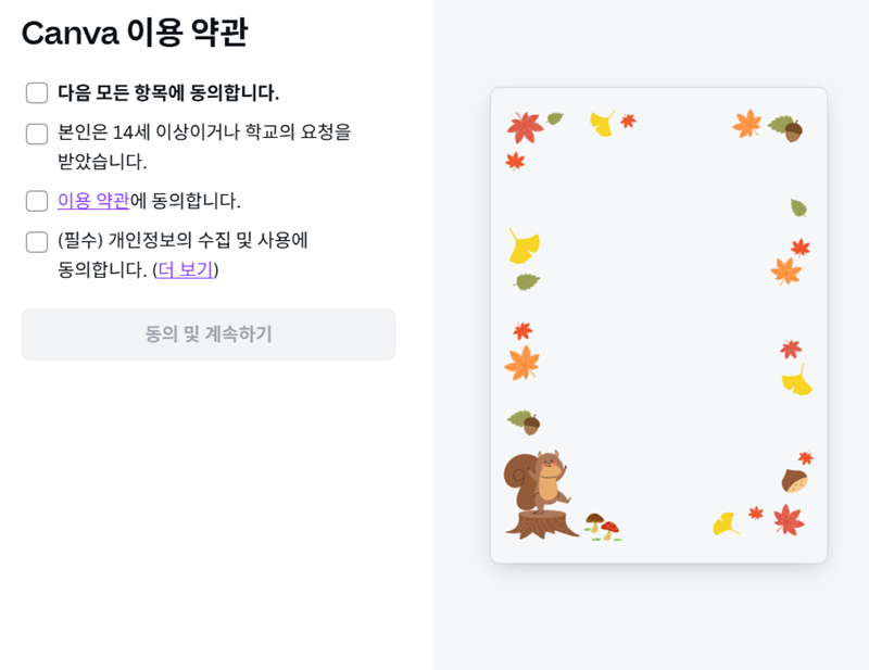 4. 편집을 시작하기 전, 간단한 동의 절차를 거쳐야 해요. 서비스를 원활하게 이용하기 위한 약관 안내이니 내용을 확인하고 동의 항목을 체크해주세요. 모든 항목에 동의해야만 다음 단계로 넘어갈 수 있으니 꼼꼼하게 읽어보고 '동의 및 계속하기'를 눌러 진행하면 됩니다.