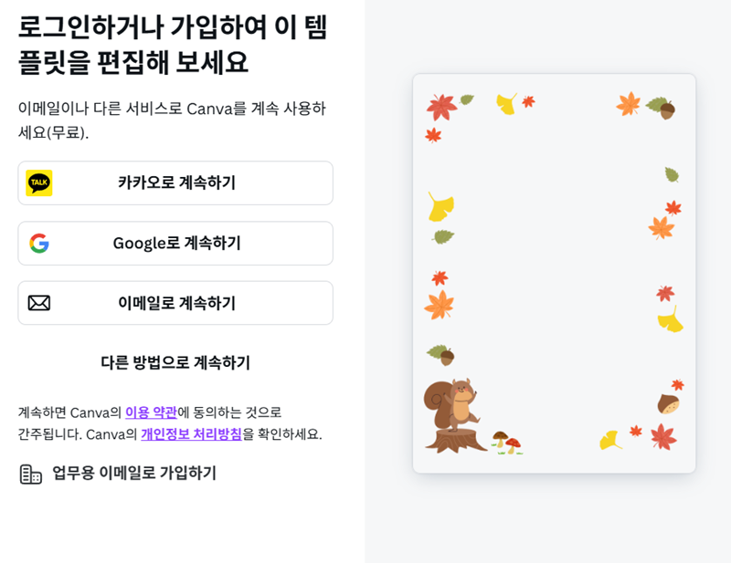 5. 이제 거의 다 왔어요. 내가 선택한 디자인을 자유롭게 편집하려면 로그인이 필요해요. 기존에 사용하던 계정이 있다면 바로 로그인하면 되고, 처음이라면 카카오톡, 구글, 이메일 등 편한 방법으로 간단하게 가입할 수 있습니다. 로그인 후 나타나는 편집 화면에서 편지지를 PDF 파일로 다운로드 가능합니다.