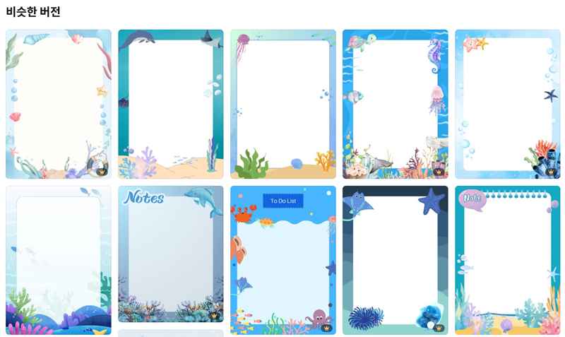 6. 만약 처음에 골랐던 디자인이 조금 아쉽게 느껴진다면, 비슷한 분위기의 다른 버전들을 둘러보는 것도 좋은 방법이에요. 한 가지 디자인에 얽매이지 않고, 바다나 숲처럼 비슷한 주제를 가진 다양한 템플릿들을 비교해 보면서 최종적으로 가장 마음에 드는 것을 선택할 수 있습니다.