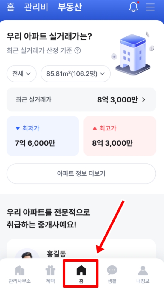 2. 앱의 메인 화면인 '홈'으로 들어갑니다. 여기에서는 우리 아파트의 최근 실거래가, 최저가, 최고가 정보를 한눈에 볼 수 있으며, 주변의 전문 중개사 정보도 함께 확인할 수 있어 부동산 관련 동향을 파악하는 데 도움이 됩니다.
