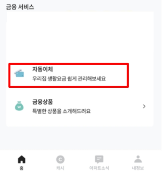 3. 화면을 아래로 내려 '금융 서비스' 항목을 찾은 후, '자동이체' 부분을 선택합니다. 이곳에서는 '우리집 생활요금 쉽게 관리해보세요'라는 안내 문구와 함께 생활에 필요한 각종 요금을 편리하게 관리할 수 있는 기능으로 연결됩니다.
