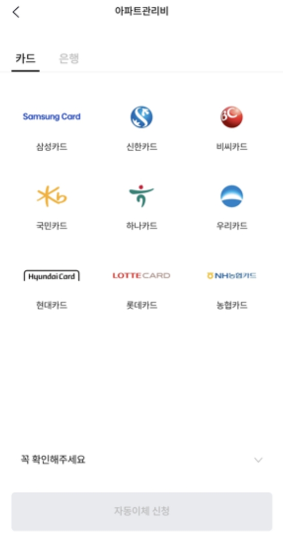 5. 아파트 관리비를 결제할 방법을 고르는 화면이 나타납니다. 먼저 '카드' 탭이 보이며, 삼성카드, 신한카드, 국민카드를 비롯한 여러 카드사 중에서 본인이 사용하고자 하는 카드를 선택할 수 있습니다.