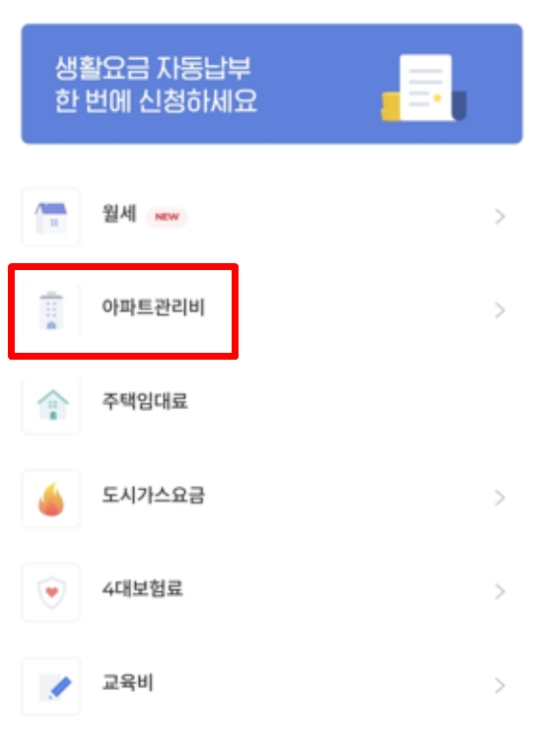 4. '생활요금 자동납부' 화면으로 넘어가면 다양한 자동납부 신청 항목들이 나타납니다. 월세, 주택임대료, 도시가스요금 등 여러 항목 중에서 우리는 '아파트관리비'를 선택하여 다음 단계로 진행합니다.
