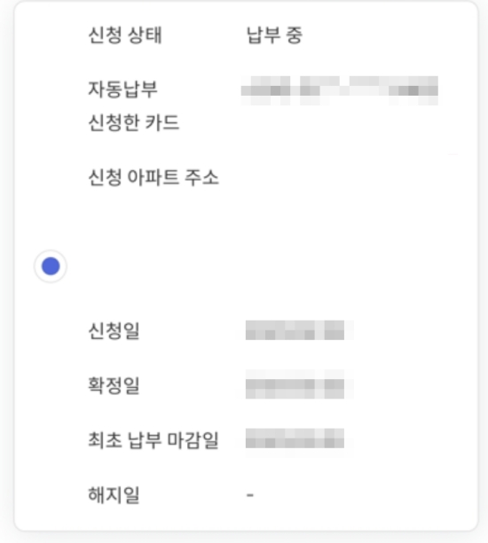 8. '신청내역'을 통해 자세한 내용을 확인할 수 있습니다. 현재 '납부 중'이라는 신청 상태와 함께 자동납부를 신청한 카드 정보, 아파트 주소, 신청일, 확정일, 최초 납부 마감일까지의 모든 일정을 한 번에 볼 수 있어 전체적인 납부 현황을 투명하게 관리할 수 있습니다.