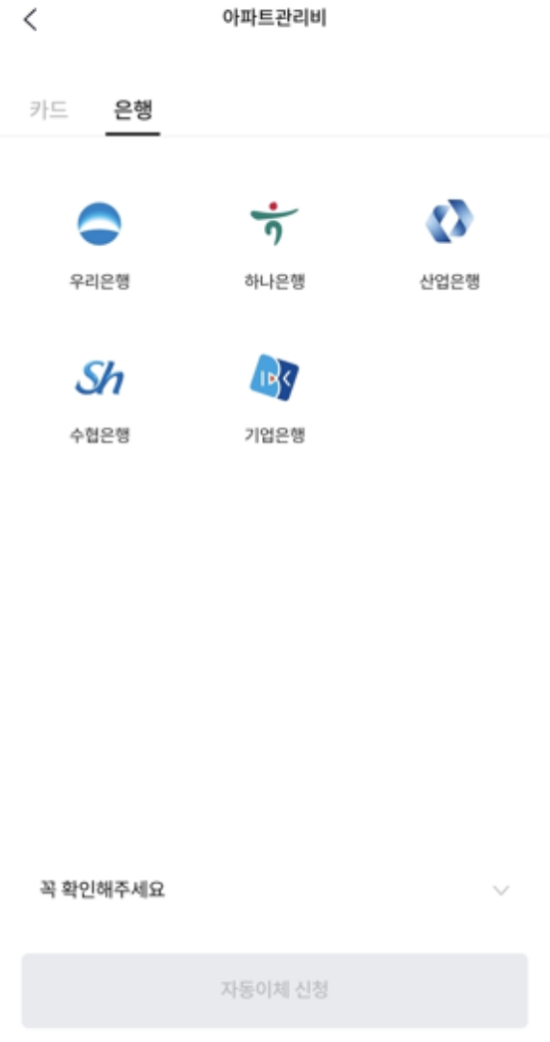 6. 만약 계좌이체를 원한다면 상단의 '은행' 탭을 선택합니다. 우리은행, 하나은행, 산업은행, 수협은행, 기업은행 등 주거래 은행이나 원하는 은행을 선택하여 관리비 자동이체를 설정할 수 있습니다.