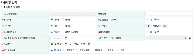 1. '2024년 귀속 퇴직소득 지급명세서 모의계산' 화면에서 소득자의 기본 정보를 입력하는 것으로 시작합니다. 주민등록번호, 성명과 같은 인적사항과 함께 거주 구분, 퇴직 사유 등 본인의 상황에 맞는 항목을 정확하게 선택하여 기입합니다. 이 정보는 세액 산출의 기초가 되므로 빠짐없이 작성해야 합니다.