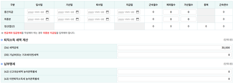 5. 근속연수를 산정하기 위해 근무 기간에 대한 날짜를 정확하게 입력합니다. 중간지급과 최종분에 해당하는 각 기간의 입사일과 퇴사일, 그리고 지급일까지 모두 기입해야 합니다. 날짜 정보가 정확해야 전체 근속 월수와 연수가 올바르게 계산되어 세액에 반영됩니다.
