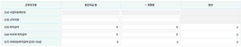 3. 이제 근무처별로 급여명세 내역을 상세히 작성합니다. 근무했던 곳의 등록번호와 상호를 적고, 중간지급이나 최종분 등 해당하는 항목에 퇴직급여와 비과세 퇴직급여액을 각각 입력합니다. 과세대상 금액은 자동으로 계산되므로, 받은 총액과 비과세 금액만 정확히 기입하면 됩니다.