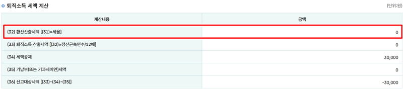 8. 모든 정보를 입력하고 계산을 마치면 최종 산출된 세액을 확인할 수 있습니다. '퇴직소득 세액계산' 표에서 '(32)환산산출세액' 항목을 보면, 입력된 정보를 바탕으로 계산된 예상 세액이 얼마인지 나타납니다. 이 금액을 통해 실제 납부해야 할 세금 규모를 미리 파악하고 대비할 수 있습니다.