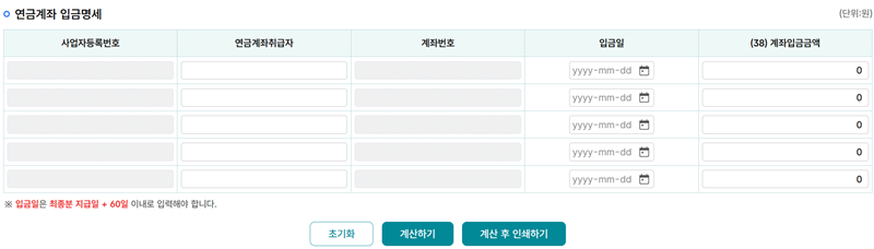 7. 퇴직금을 연금계좌로 이전한 경우, 관련 정보를 입력하여 세금 이연 혜택을 받을 수 있도록 합니다. 연금계좌를 개설한 금융사의 등록번호와 계좌번호, 그리고 입금한 날짜와 금액을 순서대로 작성합니다. 해당 사항이 있다면 빠짐없이 내용을 채워 넣어 절세 혜택을 받는 것이 좋습니다.