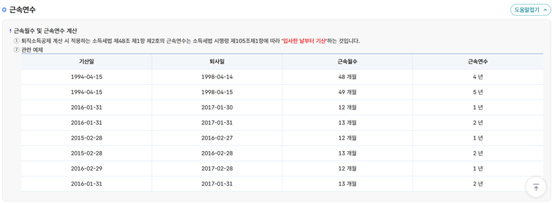 4. 근속연수 계산 방식을 확인하는 부분입니다. 퇴직소득세는 근속연수에 따라 공제금액이 달라지기 때문에 중요한 항목입니다. 계산 시 1년 미만의 기간은 1년으로 보아 계산된다는 점을 참고하면, 자신의 근속연수가 어떻게 적용될지 미리 이해하는 데 도움이 됩니다.