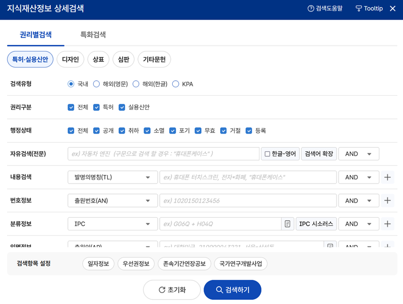 3. 상세검색 화면으로 이동하면 여러 조건을 설정하여 탐색의 범위를 좁힐 수 있습니다. 권리 구분, 행정 상태와 같은 세부 항목을 지정하고, 찾으려는 내용과 관련된 핵심 단어를 입력하여 보다 정확한 결과를 얻을 수 있도록 구성되어 있습니다.