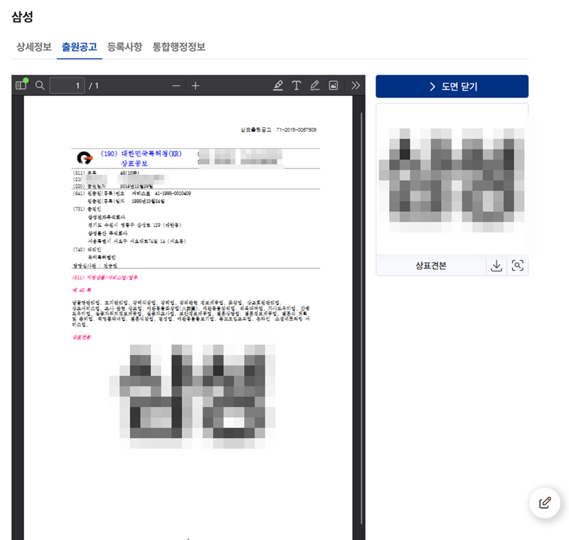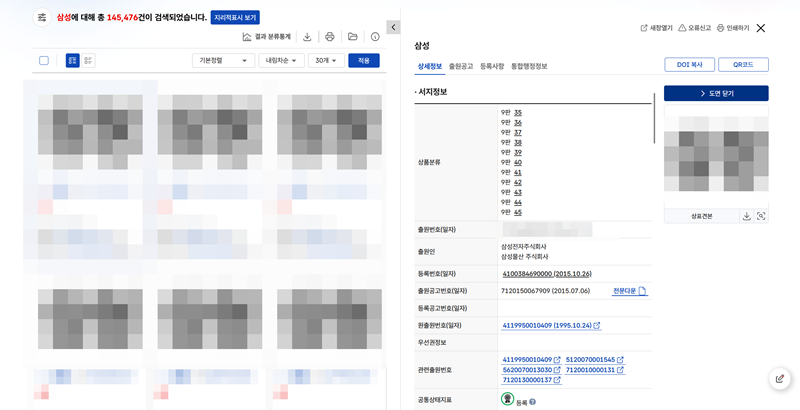 6. 결과 목록에서 특정 상표를 선택하면 더 상세한 정보를 열람할 수 있는 화면으로 넘어갑니다. 여기서는 출원인 정보, 출원 및 등록 번호, 상품 분류 등 해당 상표에 대한 구체적인 현황과 권리 정보를 자세하게 파악할 수 있습니다.