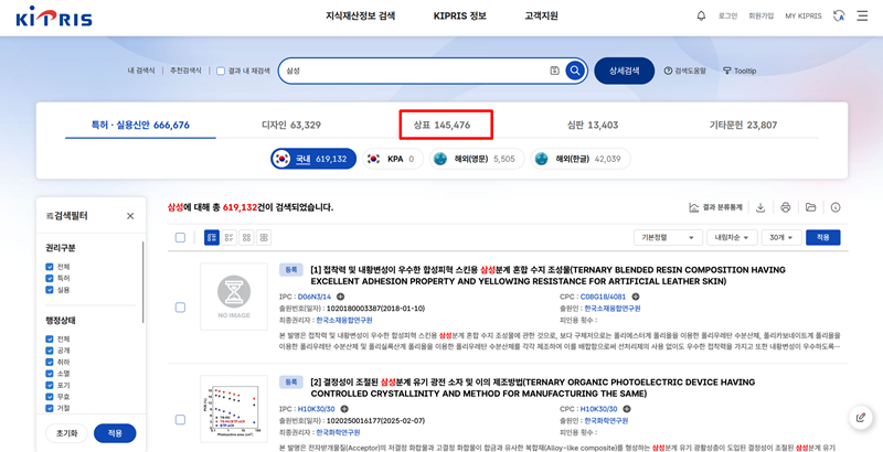 4. 검색창에 '삼성'과 같은 특정 명칭을 기입하고 나면, 권리별로 몇 개의 결과가 나왔는지 한눈에 볼 수 있습니다. 특허, 디자인, 상표 등 다양한 분야의 수치가 나타나는데, 여기서 '상표' 항목을 확인하여 관련된 내용을 집중적으로 살펴볼 수 있습니다.
