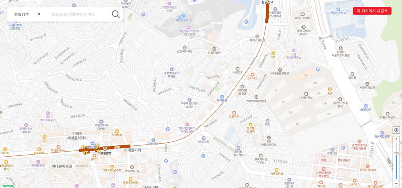 2. '지도 검색'을 선택하면 현재 위치나 지정한 장소를 중심으로 주변에 어떤 가게나 기관이 있는지 지도를 통해 시각적으로 보여줍니다. 지도를 움직여가며 원하는 곳의 정보를 바로바로 확인할 수 있고, '이 위치에서 재검색'을 통해 현재 보고 있는 지도 화면을 기준으로 다시 찾아볼 수도 있어요.