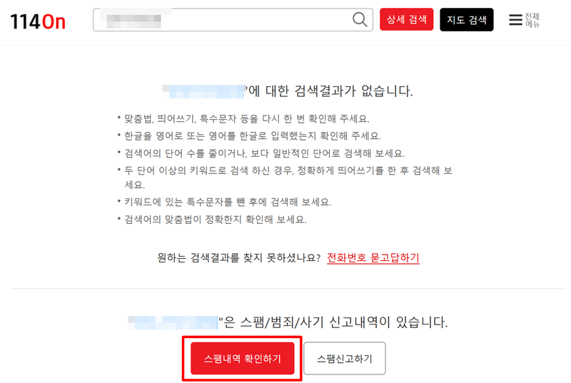 3. 찾으려는 정보가 등록되어 있지 않을 때 '검색결과가 없습니다'라는 문구가 나타날 수 있어요. 하지만 그 아래에 해당 번호가 스팸이나 사기 관련 신고 이력이 있는지 알려주기도 합니다. 만약 신고 내역이 있다면 '스팸내역 확인하기'를 통해 자세한 내용을 알아볼 수 있습니다.