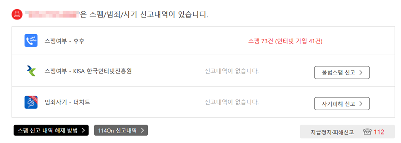 5. 번호를 조회하면 다른 이용자들이 신고한 내역을 바탕으로 스팸 여부를 알려줍니다. 어떤 유형의 신고가 몇 건이나 접수되었는지 구체적인 수치로 보여주기 때문에 번호의 안전성을 판단하는 데 유용합니다. 신고 내역이 없다면 '신고내역이 없습니다'라고 표시되니 안심할 수 있어요.