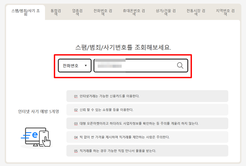 6. 홈페이지에서는 안전한 인터넷 거래를 위한 유용한 정보도 함께 알려주고 있어요. 지나치게 저렴한 가격을 제시하는 직거래는 주의하고, 신뢰할 수 있는 쇼핑몰을 이용하는 등 인터넷 사기를 예방할 수 있는 5가지 방법을 안내하여 사용자들이 피해를 보지 않도록 돕고 있습니다.