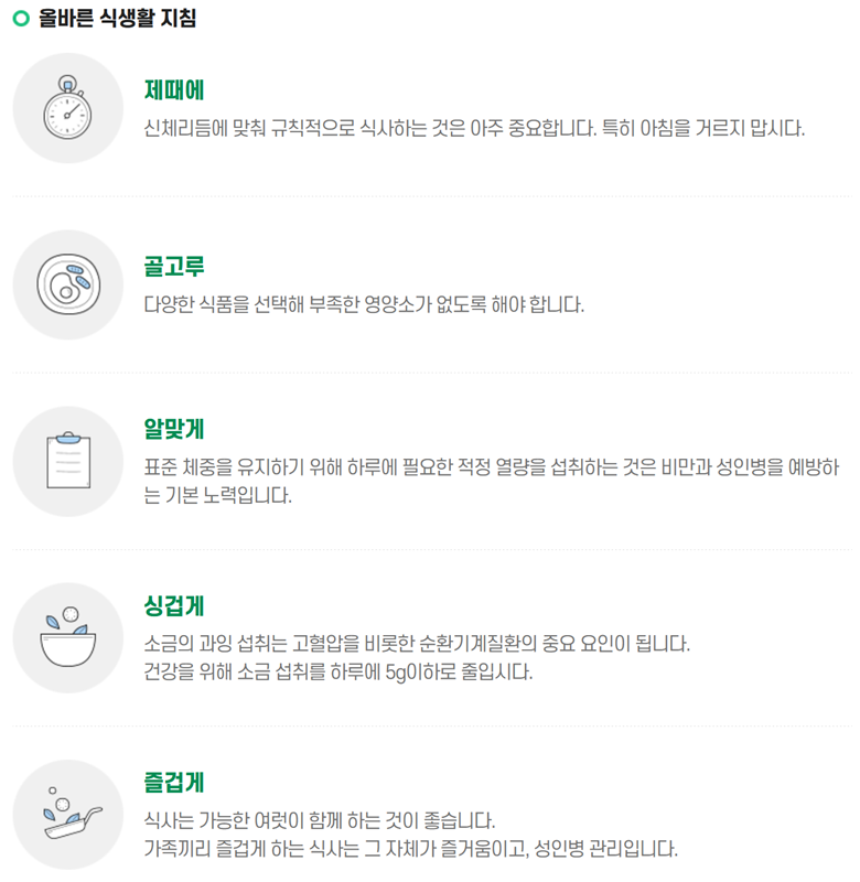 7. 자신의 상태를 확인한 후에는 '올바른 식생활 지침'을 읽어보는 것도 좋습니다. 제때에, 골고루, 알맞게, 싱겁게, 즐겁게 식사하는 5가지 지침은 건강한 생활을 유지하는 데 유용한 길잡이가 되어줍니다.