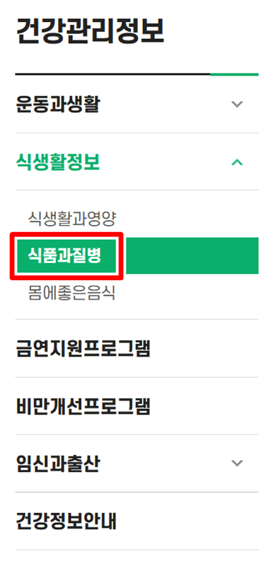 3. '식생활정보'를 선택하면 왼쪽에 새로운 메뉴가 나타납니다. 식생활과영양, 식품과질병, 몸에좋은음식 등의 항목 중에서 '식품과질병'을 선택하면 나의 신체질량지수를 확인하는 곳으로 이동할 수 있습니다.