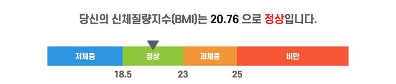 5. 계산을 마치면 '당신의 신체질량지수(BMI)는 20.76으로 정상입니다'와 같이 결과가 나타납니다. 저체중, 정상, 과체중, 비만으로 나뉜 구간에서 현재 자신의 위치가 어디인지 한눈에 확인할 수 있습니다.