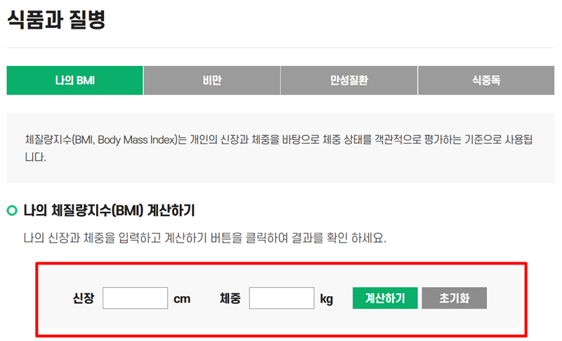 4. '식품과 질병' 페이지의 '나의 BMI' 항목에서 자신의 신장(cm)과 체중(kg)을 각각 입력한 뒤, 오른쪽에 있는 '계산하기'를 눌러주세요. 정보를 다시 입력하고 싶을 때는 '초기화'를 이용하면 됩니다.