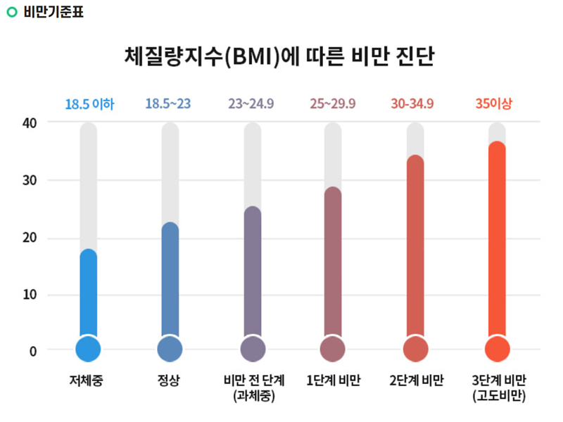 6. 더 자세한 기준을 알고 싶다면 하단의 '비만기준표'를 참고할 수 있습니다. 신체질량지수 수치에 따라 저체중, 정상, 비만 전 단계, 1단계 비만, 2단계 비만, 3단계 비만(고도비만)으로 세분화된 내용을 보여줍니다.