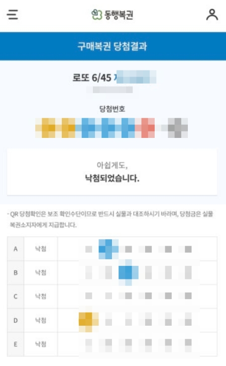 4. QR코드 인식이 완료되면 곧바로 구매한 복권의 당첨 결과를 보여주는 화면이 나타납니다. 당첨 번호와 내가 선택한 번호를 비교하여 보여주며, 아쉽게도 낙첨되었다는 문구를 통해 결과를 즉시 알 수 있습니다. 보조 확인 수단이므로 실물과 대조하는 것이 좋습니다.