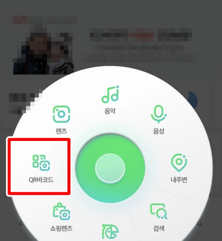 2. 녹색 아이콘을 누르면 여러가지 기능이 원형으로 나타납니다. 여기서 'QR코드'라고 적힌 항목을 찾아 선택하면 카메라가 활성화되면서 코드를 인식할 준비를 마칩니다. 렌즈, 음악, 음성 등 다른 기능들 사이에서 쉽게 찾을 수 있습니다.