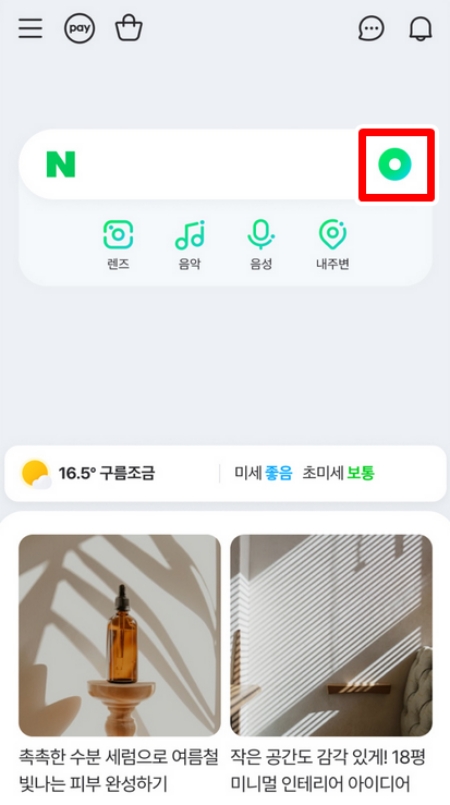 1. 네이버 앱을 실행한 후, 화면 중앙 검색창 오른쪽에 위치한 동그란 녹색 아이콘을 눌러주세요. 이 아이콘은 음성 검색, 내 주변 정보 등 다양한 기능으로 바로 연결해주는 역할을 합니다. 다음 단계로 넘어가기 위한 첫 번째 과정이니 기억해주세요.