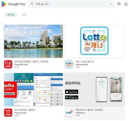5. 만약 다른 방식을 원한다면, 스마트폰의 구글 플레이 스토어 같은 앱 마켓을 열고 검색창에 '로또 qr 코드'라고 입력하여 찾아볼 수 있습니다. 이렇게 하면 당첨 확인을 도와주는 다양한 종류의 애플리케이션 목록을 볼 수 있습니다.