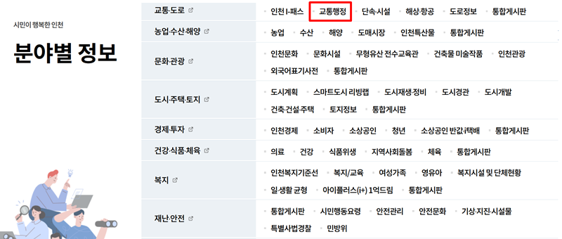 2. '분야별 정보'로 들어가면 여러 카테고리가 나옵니다. 여기서 '교통·도로' 항목 아래에 있는 '교통행정'을 찾아보세요. 이곳에서는 교통과 관련된 행정 처리나 다양한 정책 정보를 안내하고 있어 운전자에게 실질적인 도움이 되는 내용들을 쉽게 확인할 수 있습니다.