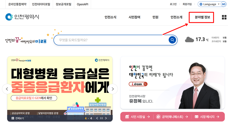 1. 각 지역의 시청 홈페이지에 접속하면 다양한 메뉴들을 볼 수 있습니다. 그중 '분야별 정보'와 같이 시에서 제공하는 여러 정책이나 정보를 분야별로 모아 놓은 곳으로 들어가면, 생활에 필요한 유용한 내용들을 한눈에 파악할 수 있어 편리합니다.