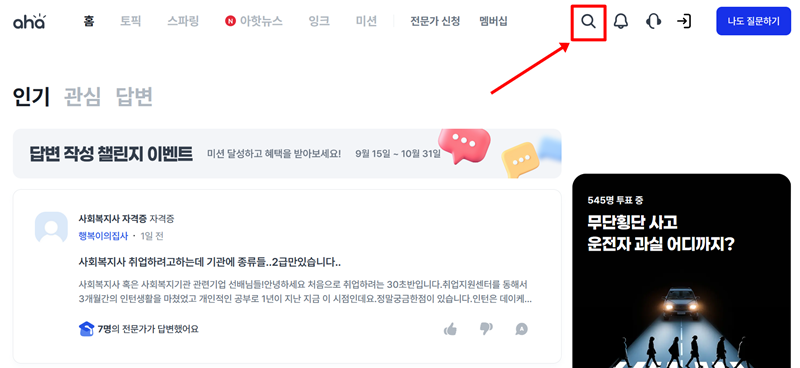 1. 홈페이지 오른쪽 위에 있는 돋보기 아이콘을 통해 궁금한 점을 바로 찾아볼 수 있어요. 평소 직장 생활이나 법률과 관련해 의문이 들었던 부분을 검색하면 다른 사람들의 유사한 고민과 답변들을 살펴볼 수 있답니다.