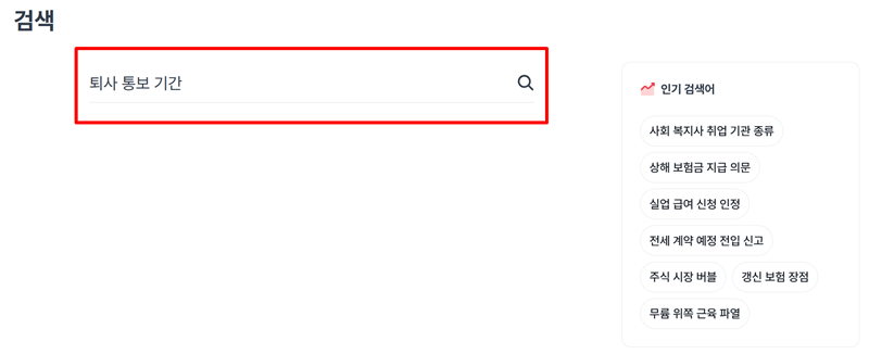 2. 검색 화면으로 이동하면 중앙에 검색어를 입력하는 창이 나타나요. 여기에 '퇴사 통보 기간'처럼 알고 싶은 핵심 단어를 입력하고 검색하면, 해당 주제와 관련된 다양한 질문과 답변들을 빠르고 쉽게 찾아볼 수 있습니다.