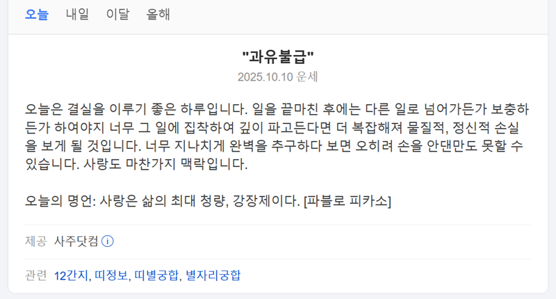 5. 생년월일과 시간을 모두 기입하고 결과를 보면 '과유불급'과 같은 사자성어와 함께 오늘의 운세가 나타나요. 하루 동안 어떤 마음가짐으로 지내는 것이 좋을지에 대한 조언과 함께 파블로 피카소의 명언처럼 삶에 영감을 주는 한마디도 함께 볼 수 있어 의미를 더해준답니다.