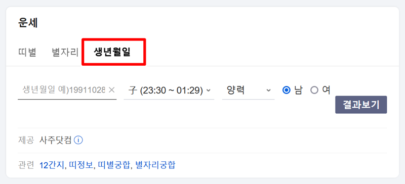 4. 더욱 자세한 풀이를 원한다면 '생년월일' 항목을 이용해 보세요. 이곳에서는 자신의 생년월일 8자리와 태어난 시각, 그리고 성별을 기입하여 그날의 운세를 확인할 수 있습니다. 모든 정보를 정확히 넣을수록 나에게 꼭 맞는 풀이를 만나볼 수 있을 거예요.
