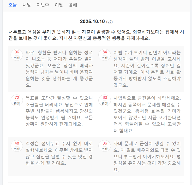 오늘 하루가 어떨지, 혹은 나와 다른 사람의 관계는 어떨지 궁금할 때 가벼운 마음으로 즐길 수 있는 운세 풀이에 대해 알아보았어요. 복잡한 절차 없이도 소소한 재미와 함께 하루를 시작하는 작은 활력을 얻을 수 있을 거예요.