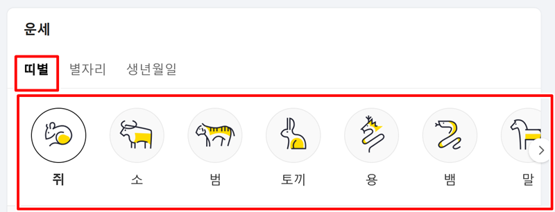 1. 운세 화면에 들어가면 먼저 '띠별' 운세를 볼 수 있어요. 상단에는 쥐, 소, 호랑이 등 열두 가지 띠가 순서대로 나열되어 있고, 이 중에서 자신의 띠를 선택하면 해당 날짜의 운세를 확인할 준비가 끝나요. 나의 띠를 찾아 가볍게 눌러보는 것으로 간단하게 시작할 수 있답니다.