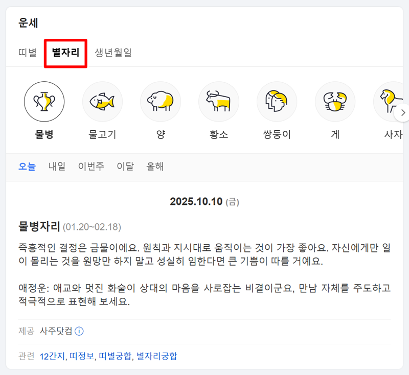 3. 만약 띠별 운세가 아닌 다른 것을 보고 싶다면 '별자리'를 선택하면 돼요. 물병자리, 물고기자리, 양자리 등 익숙한 별자리들이 나타나죠. 여기서 자신의 양력 생일에 맞는 별자리를 고르면 해당 별자리에 대한 오늘의 운세가 화면에 나타나 하루를 미리 엿볼 수 있어요.