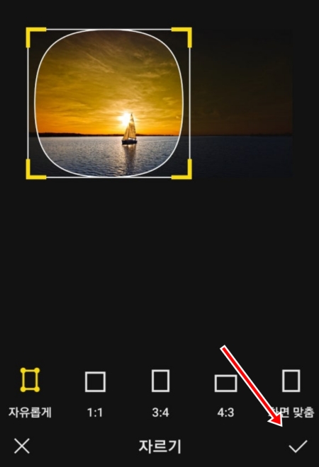 5. 자르기 기능에서는 다양한 비율을 설정하거나 자유롭게 영역을 조절할 수 있습니다. 원하는 모양으로 사진을 다듬었다면, 오른쪽 아래의 체크 표시를 눌러 편집을 최종적으로 완료해주세요. 이렇게 하면 새 사진이 추가됩니다.