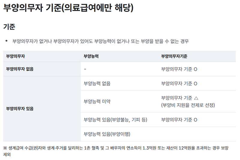 2. 부양의무자 기준은 의료급여 수급자를 선정할 때만 해당하는데요, 부양의무자가 없거나, 있더라도 부양할 능력이 없거나, 또는 부양을 받을 수 없는 상황일 때 기준을 충족한 것으로 인정돼요. 만약 부양의무자가 있지만 능력이 미약한 경우에는 부양비 지원을 전제로 조건부 선정이 될 수도 있습니다.